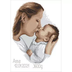 Zestaw do haftu - Metryczka - Matczyny pocałunek Zestaw z muliną zawiera: kanwę czystą typu Aida (100% bawełna) o gęstości 54 oczek/10 cm (14ct), mulinę, igłę oraz kolorowy wzór graficzny. Zestaw nie zawiera ramki. Rozmiar w krzyżykach: 162 x 230 Rozmiar w cm: