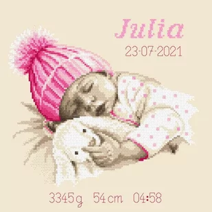Zestaw do haftu - Metryczka - Słodki sen dziewczynki Zestaw z muliną zawiera: kanwę ecru typu Aida (100% bawełna) o gęstości 54 oczek/10 cm (14ct), mulinę, igłę oraz kolorowy wzór graficzny. Zestaw nie zawiera ramki. Rozmiar w krzyżykach: 133 x 133 Rozmiar w cm: