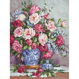 Zestaw do haftu - Róże Jej Wysokości Zestaw do haftu zawiera: kanwę czystą typu Aida (100% bawełna) o gęstości 70 oczek/10 cm (18ct), mulinę firmy Anchor, igłę oraz czarno-biały wzór graficzny. Instrukcja w języku angielskim i rosyjskim. Zestaw nie zawiera ramki. Rozmiar w cm: