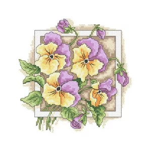 Zestaw do haftu - Urocze bratki Zestaw z muliną zawiera: kanwę czystą typu Aida (100% bawełna) o gęstości 54 oczek/10 cm (14ct), mulinę, igłę oraz kolorowy wzór graficzny. Zestaw nie zawiera ramki. Rozmiar w krzyżykach: 108 x 108 Rozmiar w cm: