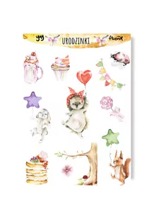 Wszystkie naklejki mają wokół kształtu biały obrys, co pięknie współgra z akwarelowym charakterem grafiki. Naklejki można wykorzystywać w wielu kreatywnych projektach. W scrapbookingu, albumach, bullet journalach, plannerach czy notesach. Na kolekcję URODZINKI składa się 11 naklejek. Całość jest pastelowa i pięknie podkreśli wyjątkowość Waszych projektów.