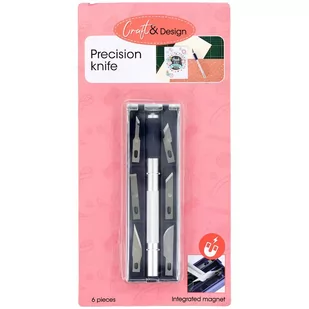 Już nie musisz martwić się wycinaniem w trudno dostępnych miejscach. Zestaw składa się z rękojeści oraz 6 wymiennych ostrzy o różnych kształtach. Ostrza montowane są w rękojeści za pomocą systemu magnesowego, który trzyma ostrze i zapobiega jego wypadnięciu. Nóż dobrze leży w dłoni dzięki gumowemu uchwytowi, który zapobiega ślizganiu się noża w ręku. Cały zestaw zawarty jest w pojemniku z tworzywa sztucznego, co ułatwia przechowywanie i transport zestawu.