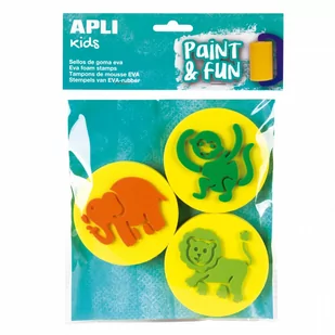 Cechy pieczątek Apli Kids: wiek: 3+; materiał: pianka EVA; wymiar: 8 cm średnicy; w zestawie 3 pieczątki ze zwierzątkami (słoń, lew, małpa); niezbędnik małego artysty.