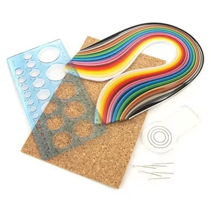Zestaw zawiera szablon do quillingu wielkości 21x10,5 cm z 27 otworami kołowymi o średnicach 2-40 mm, podkład korkowy do quillingu wielkości 25x15,5 cm , nawijak metalowy do quillingu , 6 szpilek do quillingu , 280 pasków do quillingu w 28 kolorach, specjalną nakładkę do quillingu oraz kolorową instrukcję w języku polskim