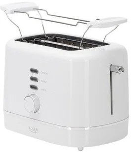 Adler AD 3224W Toster na 2 kromki, 7 stopni opiekania, biały, 850W, z funkcją STOP, REHEAT, DEFROST, ruszt do bułek, kompaktowy design.