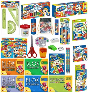 Kredki trójkątne dwustronne BAMBINO 12/24 kolory - 1 szt. Kredki BAMBINO z glinki kaolinowej 12 kolorów - 1 szt. Flamastry BAMBINO 12 kolorów - 1 szt. Ołówek do nauki pisania HB BAMBINO gruby - 2 szt. Gumka do ścierania Myszka BAMBINO biała - 1 szt.