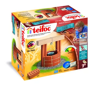 Zestaw Studnia składa się z cegiełek wielokrotnego użytku, cegiełki łączone są za pomocą kukurydzianego cementu. Cement jest: rozpuszczalny w wodzie nietoksyczny łatwy do przygotowania. Ponadto w zestawie miseczka, mini kielnia oraz instrukcja graficzna. Zestaw zawiera 28 elementów.