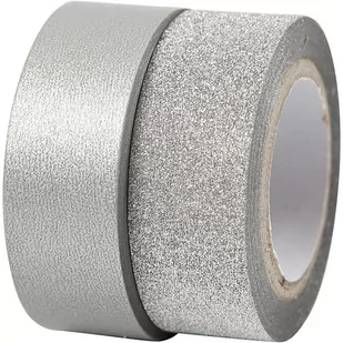 Zestaw 2 taśm ozdobnych o barwie srebra. Jedna to papierowa matowa taśma washi, druga jest foliowa z efektem brokatu. Taśmy dekoracyjne są samoprzylepne. Idealne do ozdobienia kartek okolicznościowych, zaproszeń, pamiętników, ale również dekoracji domu (szklane świeczniki, drewniane ramki, figurki z papier-mache, betonowe litery itp.). Przy porowatych powierzchniach warto użyć dodatkowo kleju (np. do decoupage), albo zabezpieczyć obklejony przedmiot lakierem, aby taśma ozdobna się dobrze trzymała.