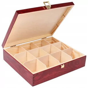 Pudełko drewniane na herbatę 12 przegródek, mahoń Wymiary zewnętrzne wraz z pokrywą: ok. 29 x 25 x 7,5 cm Wymiary wewnętrzne przegródek: ok. 7 x 5 cm Wysokość wewnętrzna pokrywy: ok. 2,4 cm Grubość ścianek ok. 0,8 - 1 cm Wyjmowane przegródki Materiał: