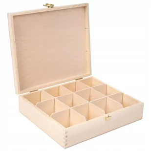 Pudełko drewniane na herbatę 12 przegródek Wymiary zewnętrzne wraz z pokrywą: ok. 29 x 25 x 7,5 cm Wymiary wewnętrzne przegródek: ok. 7 x 5 cm Wysokość wewnętrzna pokrywy: ok. 2,4 cm Grubość ścianek ok. 0,8 - 1 cm Wyjmowane przegródki Materiał: