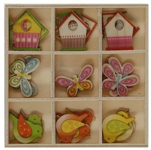 Drewniane dekoracje w drewnianym pudełku 105x105mm kolorowe 9 wzorów x 3szt. budki dla ptaków 27x30mm, motyle 30x28mm, ptaszki 29x20mm sklejka 1mm 27szt.