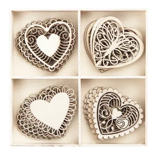 Fantastyczny zestaw kształtów z drewna a'la chipboard , które urozmaicą każdy projekt. W drewnianej skrzyneczce znajduje się 20 aplikacji, w tym 4 różne wzory. Niektóre wzory posiadają dziurkę, przez którą można przewlec np. lniane nici dpCraft i utworzyć urocze zawieszki. Wymiary opakowania: