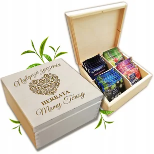 DREWNIANA SKRZYNKA Z GRAWEREM NA HERBATĘ + HERBATA Eleganckie, ręcznie wykonane PUDEŁKA NA HERBATĘ to idealny PREZENT na DZIEŃ MAMY Spersonalizowany i niezapomniany prezent odznaczający się wysoką jakością i niecodziennym wyglądem. Herbaciarka łączy w sobie zarówno walory estetyczne jak i użytkowe. Pudełko wykonane jest ze starannie wyselekcjonowanego materiału, posiada 4 przegródki, w których entuzjasta herbat będzie mógł ułożyć swoją kolekcję herbat ekspresowych. SPECYFIKACJA PUDEŁKA: 4 przegródki szerokość: