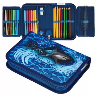 Blue Shark Rodzaj: z wyposażeniem, pojedynczy Wyposażenie : 14 flamastrów, 8 kredek, 2 ołówki , gumka, temperówka, linijka, ekierka, długopis Marka: Herlitz Typ: rozkładany pojedynczy Kod producenta: