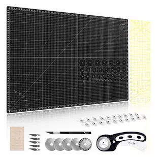 Zestaw TEXI CRAFT BLACK 90X60 zawiera: matę samoregenerującą, nóż krążkowy z zapasowymi ostrzami, liniał do patchworku i quiltingu, nóż rzemieślniczy z dodatkowymi ostrzami, klipsy do materiałów oraz naklejki antypoślizgowe. P3QRPtPzks0 Mata podkładowa - samoregenerująca Miłośnicy patchworku używają noży obrotowych razem ze specjalną podkładową matą do cięcia i innymi narzędziami. Mata do cięcia TEXI CRAFT BLACK 90X60 jest wyjątkowa, ponieważ wykonaliśmy ją ze specjalnego tworzywa, które po przecięciu samo się regeneruje i zasklepia. Możesz, więc ciąć i kroić materiał bez obaw, że się uszkodzi.
