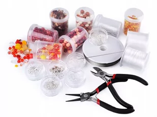 Zestaw do samodzielnego wykonania biżuterii Skład zestawu: plastikowe, zamykane pudełko szczypce biżuteryjne 12,5 cm szczypce tnące 11 cm igły do nawlekania koralików 7 pojemniczków z komponentami (zawieszki, zatyczki, itp.) 2 żyłki jubilerskie: 0,38-0,45 mm i 70-80 mm żyłka silikonowa mocna grubość 0,3 mm, ok. 150 m 6 pojemniczków z mixem koralików (kolory jak na zdjęciach)