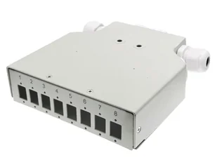 Przełącznica światłowodowa do montażu na szynie DIN (TH35, TS35, DIN-3) z otworami pod 8 adapterów SC simplex, 8 adapterów LC duplex lub 8 adapterów E2000.