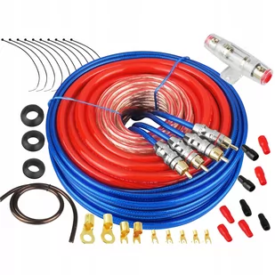 - 4 AWG kabel zasilania, czerwony, 7 x 3 x 15/ 0,20CCA 9,7 mm - 5m - 4 AWG kabel masowy, czarny, 7 x 3 x 15/ 0,20CCA 9,7 mm - 1m - przewód głośnikowy CCA 2 x 2,5 mm, 4m - wysokiej jakości kabel RCA - gniazdo bezpiecznika z bezpiecznikiem 60A - peszel - konektory - akcesoria.
