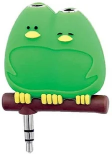 Rozdzielacz słuchawek audio w postaci zielonych ptaszków. Wykonany z metalu i silikonu. Zapakowany w blister.