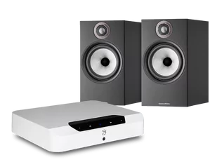 Zestaw składający się z odtwarzacza sieciowego ze wzmacniaczem Bluesound POWERNODE EDGE i kolumn Bowers & Wilkins 606 S2 Anniversary Edition