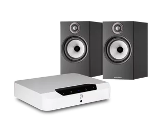 Zestaw składający się z odtwarzacza sieciowego ze wzmacniaczem Bluesound POWERNODE EDGE i kolumn Bowers & Wilkins 607 S2