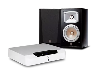 Zestaw składający się z odtwarzacza sieciowego ze wzmacniaczem Bluesound POWERNODE EDGE i kolumn Yamaha NS-333