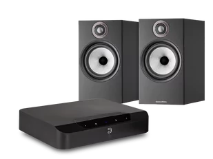 Zestaw składający się z odtwarzacza sieciowego ze wzmacniaczem Bluesound POWERNODE EDGE i kolumn Bowers & Wilkins 606 S2 Anniversary Edition