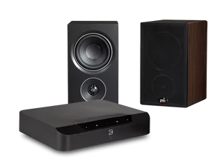 Zestaw składający się z odtwarzacza sieciowego ze wzmacniaczem Bluesound POWERNODE EDGE i kolumn PSB Speakers Alpha P3