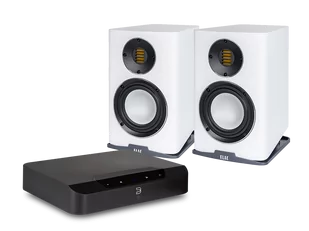 Zestaw składający się z odtwarzacza sieciowego ze wzmacniaczem Bluesound POWERNODE EDGE i kolumn ELAC Carina BS243.4