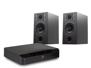 Zestaw składający się z odtwarzacza sieciowego ze wzmacniaczem Bluesound POWERNODE EDGE i kolumn Indiana Line Diva 3