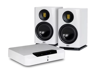 Zestaw składający się z odtwarzacza sieciowego ze wzmacniaczem Bluesound POWERNODE EDGE i kolumn Elac Solano BS283