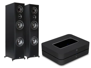 Zestaw składający się z bezprzewodowego, strumieniowego wzmacniacza multiroom Bluesound Powernode oraz dwóch głośników PSB Speakers Imagine T54