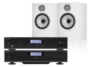 Zestaw stereo składający się ze wzmacniacza zintegrowanego Rotel A14 MKII, odtwarzacza CD Rotel CD14 MKII oraz głośników Bowers & Wilkins 606 S3.