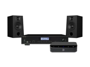 Zestaw stereo składający się ze wzmacniacza zintegrowanego Rotel A14 MkII, streamera Node Nano oraz kolumn Indiana Line Lira 3