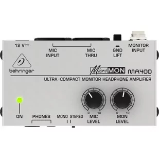 Kompaktowy monitorowy wzmacniacz słuchawkowyMówi się, że rozmiar ma znaczenie. Lecz czasami to stwierdzenie może być fałszywe. W obudowie tego małego urządzenia znajdziesz tą samą technologię, którą znajdziesz w profesjonalnych urządzeniach audio firmy behringer. MA400 posiada konektory Mic In, MIC Through XLR ze zintegrowanym przełącznikiem Ground Lift. PARAMETRY TECHNICZNEKompaktowy wzmacniacz słuchawkowy do zastosowań studyjnych i scenicznychMikser osobisty typu "more me" do miksowania toru głównego i mikrofonowego z odsłuchem na słuchawkachUniwersalne złącza wejściowe Mic In oraz przelotowe Mic Through z przełącznikiem odcięcia masyStereofoniczne wejście Monitor z dedykowanym regulatorem poziomu i przełącznikiem mono/stereoWyjście słuchawkowe dużej mocy ze złączami jack 1/4" oraz jack 1/8"Zasilacz 12V DC w komplecieWysokiej jakości podzespoły i wytrzymała konstrukcja zapewniające długotrwałe użytkowanie.
