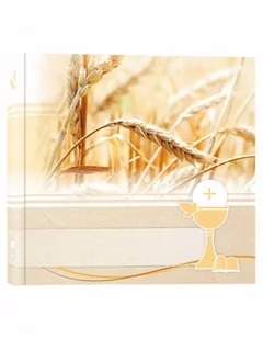 Album na pamiątkę Komunii Świętej, 24 strony Okładka utrzymana w odcieniach beżu i złota, ze zdjęciem kłosów zboża oraz kielichem. Album zawiera 24 białe strony poprzekładanych pergaminem. Wymiary kart albumu to 24 cm x 24 cm. W albumach klasycznych bardzo istotne jest staranne wklejenie zdjęć. W tym celu polecamy Państwu fotorożki i fotoprzylepce.