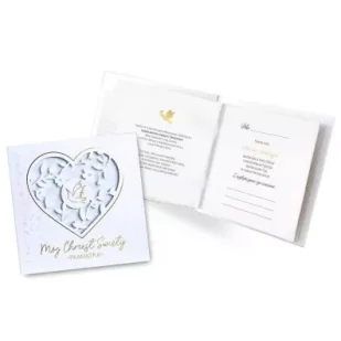 złota oraz perłowa folia wnętrze: kolorowe, z grafikami, cytaty, miejsce na dedykację i wpisanie miejsca/godziny uroczystości, gratis: koperta na drobny upominek wewnątrz, okazja: chrzest