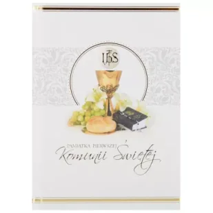 Książeczka okolicznościowa z okazji pierwszej komunii świętej. Twarda okładka ze złotą folią.