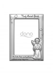 Ramka srebrna Twój Anioł Stróż z modlitwą za Rodziców: Do Ciebie, Boże, rączki podnoszę, o zdrowie mamy i taty proszę. . . Ramka wyprodukowany został przez włoską firmę Dono. Ramka wykonany jest z blachy aluminium pokrytej warstwą srebra. Całość zabezpieczona jest warstwą lakieru, która chroni przed czynnikami zewnętrznymi.