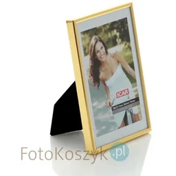 Złota, metalowa ramka fotograficzna na zdjęcie wielkości 10 na 15cm. Ładna, solidna, ciężka ramka wykonana jest ze złotego metalu. Metal jest błyszczący, ramka jest cienka. Z tyłu ramka wykończona jest czarnym aksamitem. Ramka zapakowana jest w pergamin i w białe pudełko.