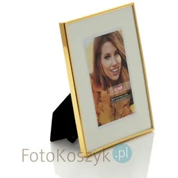 Metalowa ramka fotograficzna na zdjęcie wielkości 15x20cm. Ładna, solidna, ciężka ramka wykonana jest ze złotego metalu. Metal jest błyszczący, ramka jest cienka. W ramce jest jasno-kremowe passe-partout do zdjęcia 10x15. Z tyłu ramka wykończona jest czarnym aksamitem.