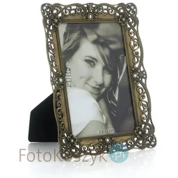 Metalowa ramka fotograficzna na zdjęcie wielkości 10 na 15 cm. Ramka to metalowy odlew w złotym odcieniu. Ramka jest starannie wykonana, każdy detal jest dokładnie odlany a ramka w całości lakierowana. Ramka jest bogato zdobiona, ma okrągłe kryształki umieszczone w kilku miejscach. O wysokiej jakości świadczy to, że z tyłu wykończona jest czarnym zamszem.