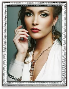 Ramka na zdjęcie 13x18 srebrna z efektem lustra Ramka na jedno zdjęcie 13x18. Ramka w stylu nowoczesnym, wykonana z metalu w kolorze błyszczącego srebra z efektem lustra. Listwa z efektem młotka, na całości ramki charakterystyczne tłoczenia. Całość utrzymana w wysokim połysku. Przód ramki zabezpieczony szkłem.