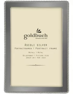 Prestiżowa ramka na zdjęcie 10x15 Srebrne wykończenie z perełkami Ramka pochodzi z kolekcji Ascoli niemieckiej firmy Goldbuch. Na jedno zdjęcie formatu 10x15. Ramka wykonana z metalu. Efektowne wykonanie, rama w kolorze błyszczącego srebra, otoczona srebrnymi, perłowymi kuleczkami. Rozmiar całkowity ramki: