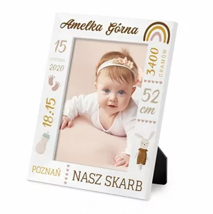Spersonalizowana biała ramka na zdjęcia z nadrukiem na narodziny Zostaliście rodzicami i pragniecie wręczyć córce pamiątkę tej najważniejszej chwili w jej życiu? Uważasz, że warto pamiętać o dacie i godzinie narodzin córki, jej wadze i wysokości tuż po porodzie? Spersonalizowana biała ramka na zdjęcia z indywidualnym nadrukiem wykonana z klasycznego drewna to praktyczny, a zarazem pamiątkowy upominek idealny na sakralne okazje , czyli chrzest , komunię i ślub , ale i nie tylko! Prostokątny kształt i duża wielkość sprawiają, że zostaną w niej doskonale uwiecznione i zabezpieczone dorodne zdjęcia tych najlepszych chwil! Drewniana ramka z nadrukiem posłuży jako oprawa pamiątki wyjątkowych wakacji nad morzem czy fotografii rodzinnego spotkania przy barwnym, świątecznym stole. Dzięki uniwersalnej kolorystyce podarek ten będzie idealnie pasował do każdego wnętrza. Twoja spersonalizowana ramka na zdjęcia stanie na komodzie oraz zostanie powieszona na ścianie. Od Ciebie zależy, jaki finalny wygląd obierze wybrany przedmiot! Skorzystaj z kreatora personalizacji , dobierz nadruk i stwórz niecodzienny upominek dopasowany do hobby i zawodu bliskiej osoby oraz zbliżającej się okazji ! Ochroń pamiątki najważniejszych chwil i już dziś wybierz spersonalizowaną ramkę! wymiary ramki - 21,5 cm x 27,5 cm wymiary zdjęcia - 15 cm x 21 cm kolor - biały materiał - drewno uchwyt do umieszczenia na ścianie i podpórka do postawienia ramki na półce gratis oryginalna personalizacja dopasowana do okazji idealny prezent dla dziewczynki na narodziny RAMK-WH-010