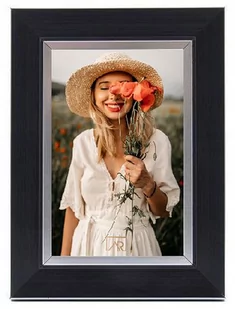 Ramka w kolorze czarnym ze srebrnym paskiem od środka. Do postawienia w pionie i poziomie lub zawieszenia na ścianie. Idealna na prezent ślubny, komunijny i inne okazje. Pasuje do nowoczesnych jak i klasycznych wystrojów wnętrz. Czarna ramka 13x18 cm Wymiary zdjęcia:
