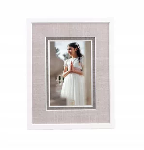 szklana Do postawienia w pionie i poziomie lub zawieszenia na ścianie. Rama zewnętrzna biała, wykonana z tworzywa. Otoczka zdjęcia w kolorze ciemnobeżowym, o strukturze płótna. Niezwykła stylistyka pięknie eksponująca fotografię. Ramka idealna na zdjęcie ślubne, komunijne itp.