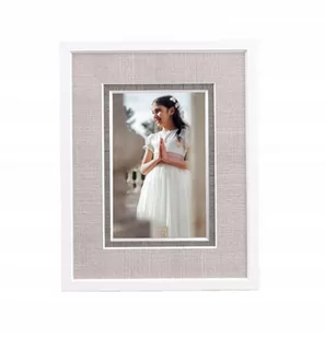 Rama zewnętrzna biała, wykonana z tworzywa. Otoczka zdjęcia w kolorze szaro-beżowym, o strukturze płótna.