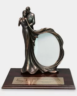 Piękna ramka na zdjęcie ślubne z rzeźbą przedstawiająca zakochaną parę. Oferta uzupełniona o drewniane tablo z grawerowaną dedykacją, tworzy idealny pomysł na prezent ślubny lub na rocznicę. Na tabliczce możesz umieścić tekst, zdjęcie lub logo. Figura wykonana bardzo precyzyjnie, z dbałością o najdrobniejsze detale. Robi duże wrażenie estetyczne i ma ponadczasowy styl.
