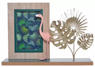 Nietypowa ozdoba w postaci ramki z ozdobnymi elementami. Zdjęciu tu umieszczonemu towarzyszą ozdoby w postaci złotych liści i różowego pelikana. Ramka wykonana jest z jasnego drewna z zielonymi akcentami, zaś podstawka wykończona jest zieloną farbą, nadającą produktowi tropikalnego charakteru. Format zdjęcia – 10x15 cm Wymiary całkowite produktu – 30x21x7 cm Wykonane z drewna